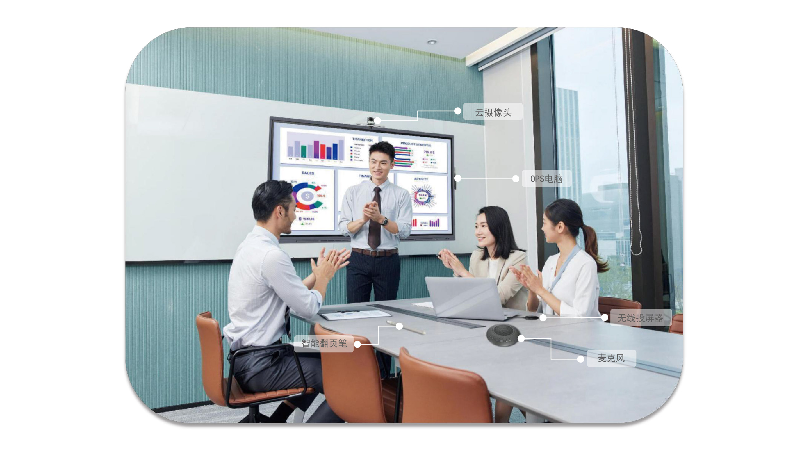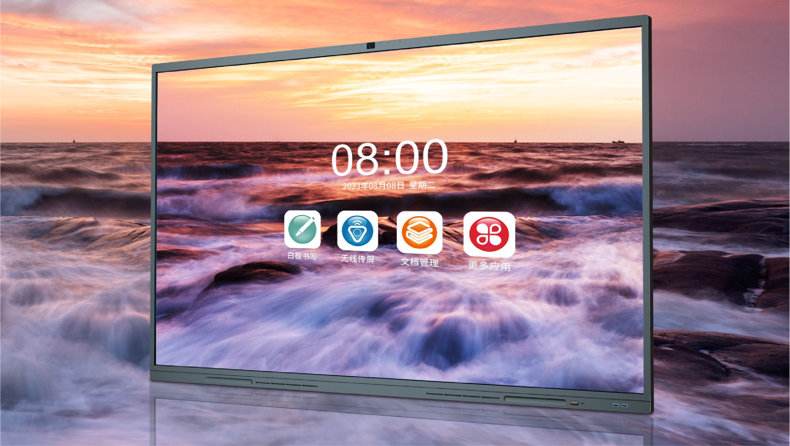 八機合一:集合投影儀、幕布、電子白板、電視、電腦、平板、機頂盒、音響八種設(shè)備功能于一體,化繁為簡,提高企業(yè)形象、辦公效率。