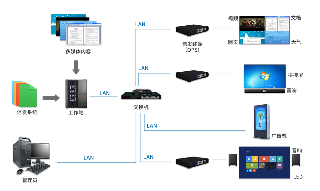 企業(yè)辦公信息發(fā)布系統(tǒng)總共分為5個(gè)部分,分別為:信息管理端、工作站、局域網(wǎng)、信息發(fā)布端及顯示終端。這一個(gè)完整的系統(tǒng)可將視頻、圖片及文字統(tǒng)一調(diào)配分別投放在各顯示終端。此外,顯示終端還能開發(fā)更多功能,例如用戶可在顯示終端實(shí)現(xiàn)反向控制對(duì)系統(tǒng)信息作出反饋等。