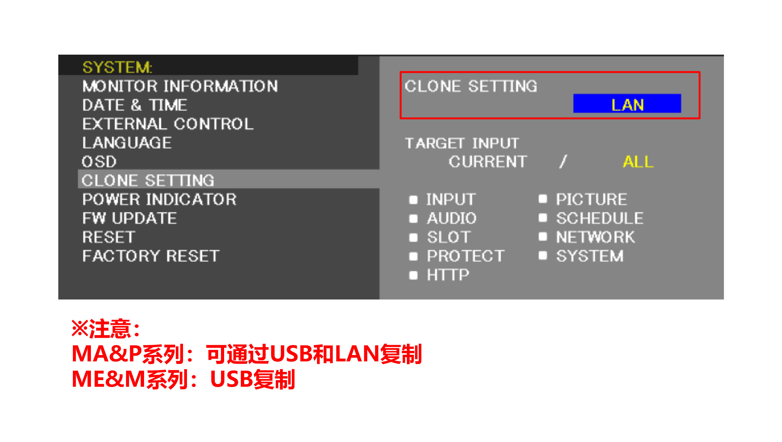 通過U盤或LAN,可將目標顯示器的參數(shù)復(fù)制到指定顯示器